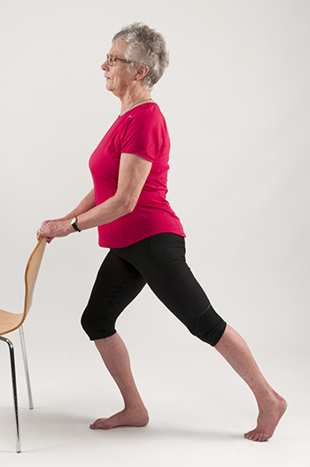 Stå med vægten på det raske ben, og hold det opererede ben strakt bagud, så du kan mærke, at det strammer foran på hoften. Undgå at læne dig fremad med overkroppen. Hold spændingen i 20-30 sekunder. Hold en pause og gentag øvelsen 3 gange.