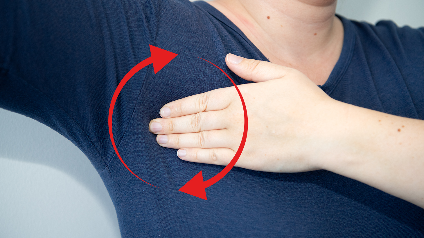 - Med flad hånd stryges henover brystet med retning mod brystvorten. Brystet stryges hele vejen rundt.